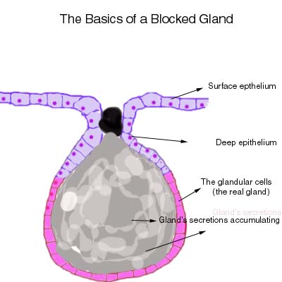Growths are not the only cause of lumps. Blocked glands and abnormal fluid collections can also cause lump formation. This is an important cause of lumps in the female reproductive organs. The next drawings will explain how blocked glands cause lumps.