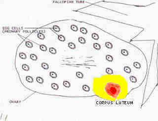 A very important change is taking place in the ovary. A new structure is developing from the remains of the follicle which released the egg cell. This new structure is called a CORPUS LUTEUM (Latin meaning yellow body). The corpus luteum is the only structure which produces the hormone progesterone in significant quantities.